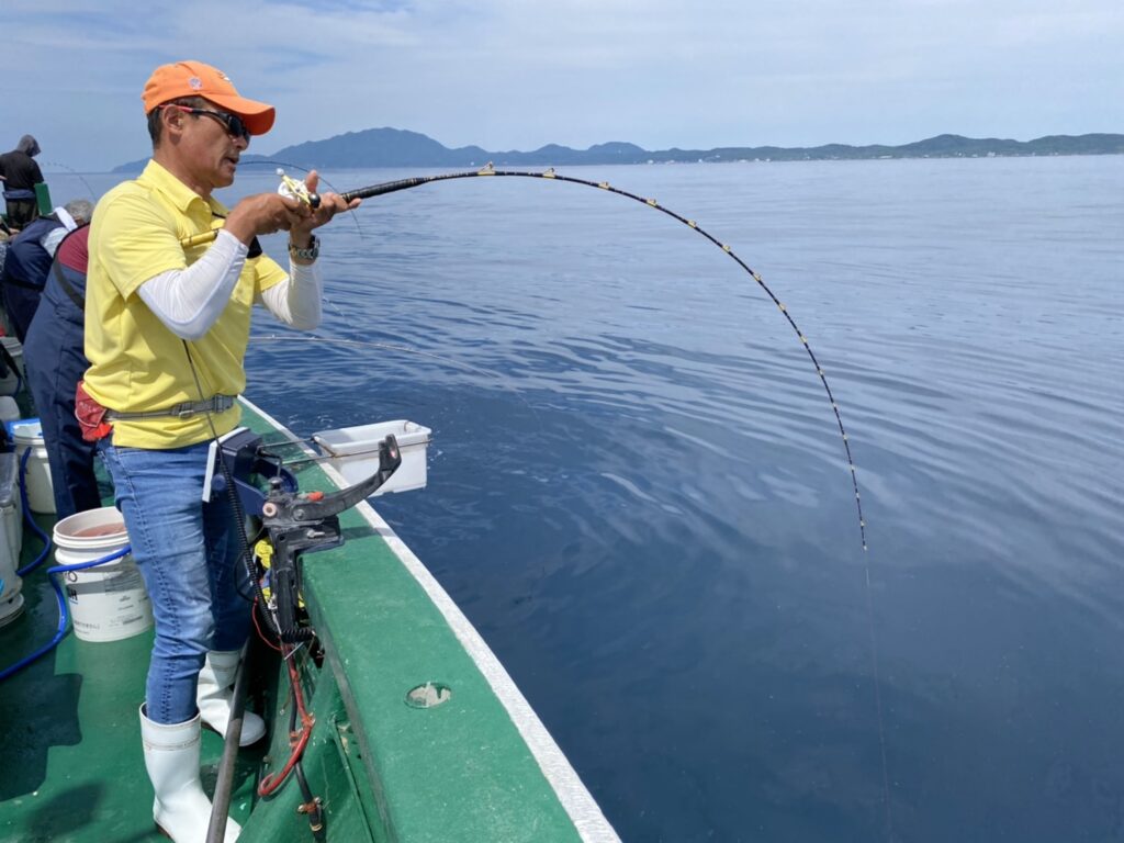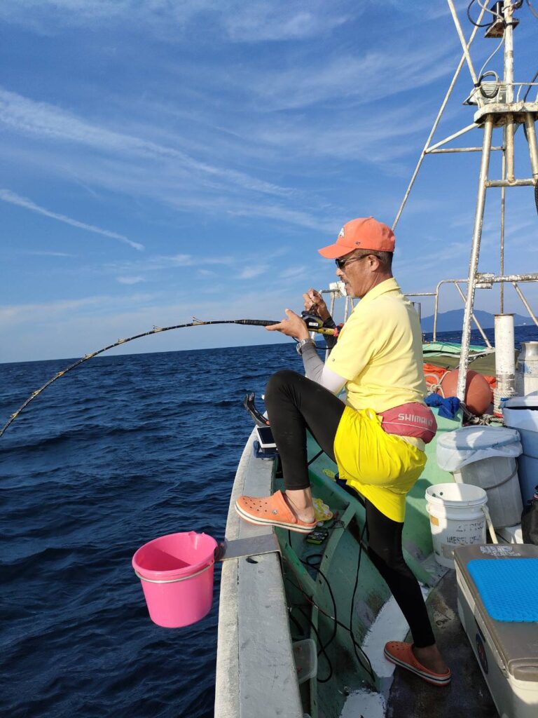 ※マダイが引き込んだらロッドの角度を海面と水平程度に保ち、マダイの引きが止まったらロッドの角度を上45度程度に上げ、これを丁寧に繰り返しながら巻き上げを行うが、このいわゆるポンピング動作は、急なアクションは針外れにつながる為、繰り返しになりますが、ポンピング動作もラインが常に一定になるように心掛けながら行う