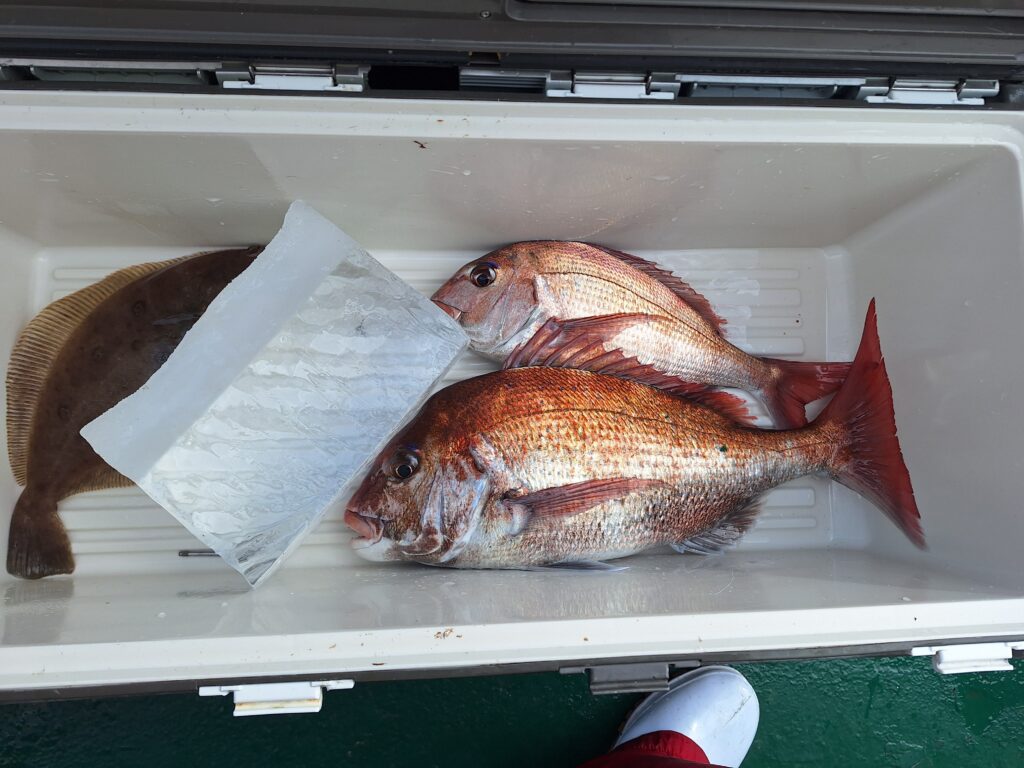 以上と、大変厳しい状況下だったんですが、ラッキーにも本命マダイを2枚ゲットする事が出来ました。